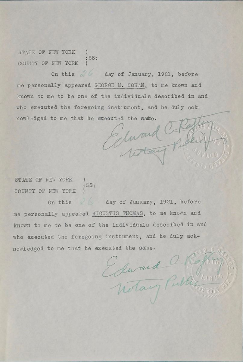 American playwright, songwriter, and actor (1878–1942), widely regarded as the father of American musical comedy, who takes a place among the most beloved entertainers of his era. Two DSs: a memorandum of agreement between A. E. Thomas and Cohan, dated January 14, 1920, in which the former grants Cohan the rights to a dramatization “temporarily entitled ‘David's Adventure’”; and an agreement between Augustus Thomas and Cohan, dated January 26, 1921, in which the former grants Cohan the rights to “a certain original play or dramatic composition…entitled, ‘Nemesis.’” Both documents are signed at the conclusion in fountain pen by Cohan, and countersigned by the respective authors. In overall fine condition.