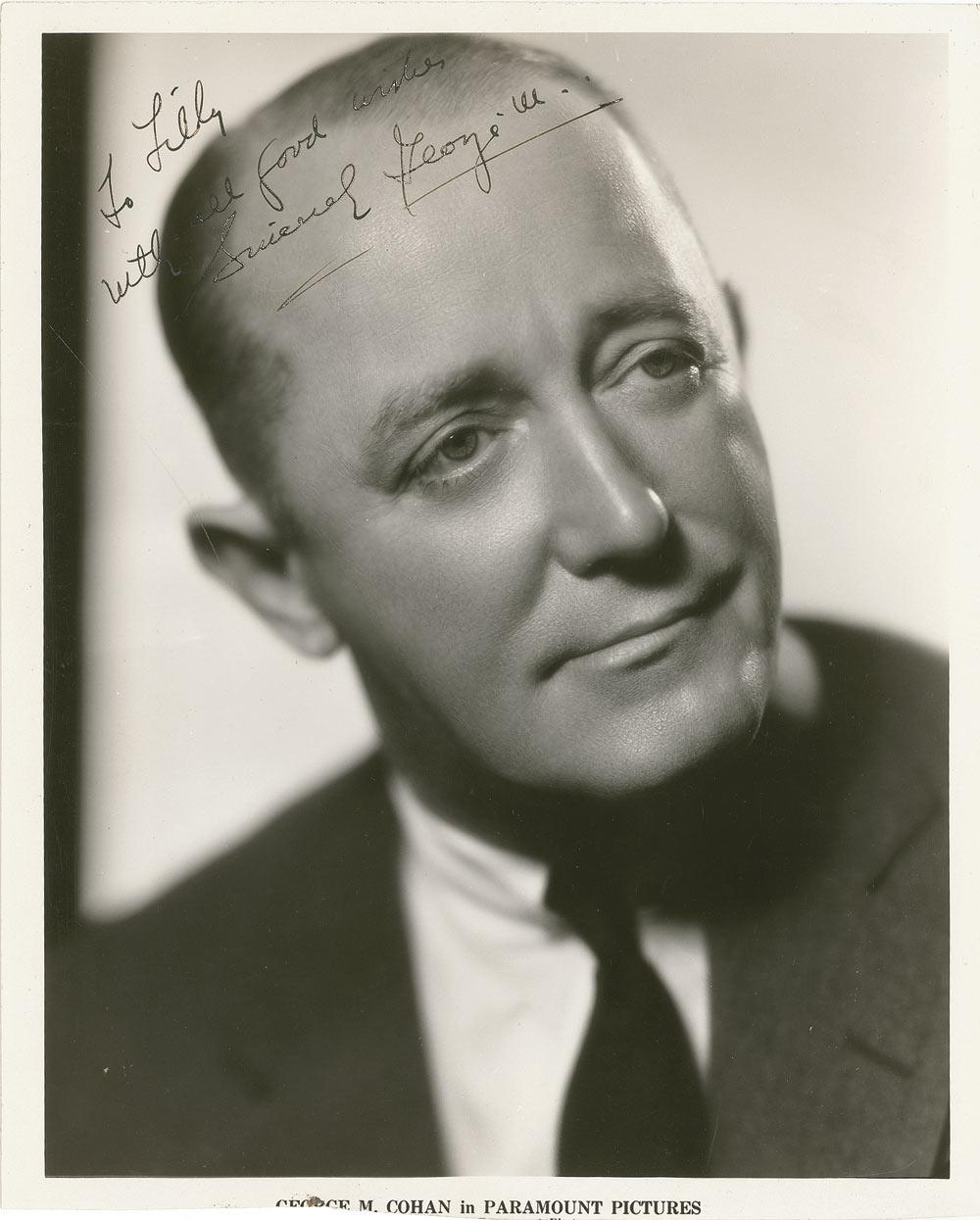 American playwright, songwriter, and actor (1878–1942), widely regarded as the father of American musical comedy, who takes a place among the most beloved entertainers of his era. Vintage glossy 8 x 10 Paramount publicity photo, signed and inscribed in fountain pen “To Lilly, with all good wishes, Sincerely, George M.” In very good condition, with lightly trimmed lower edge, a couple light creases, and some light surface loss around portions of signature and inscription.