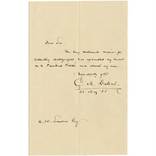 <B>George M. Dallas Autograph Letter Signed</B></I> "<I>G. M. Dallas</B></I>". One page, 4.5" x 7", May 21, 1855, fold creases, else bright and in fine condition. This letter proves that autograph collecting was popular even in the mid-19th century! The former vice president responds to a request for an autograph: "<I>Dear Sir, The long continued mania for collecting autographs has exhausted my means as to President Polk's and almost my own</B></I>." <BR><BR><BR><b>Shipping:</b> Flat Material, Small (<a target="_blank" href="http://www.heritageauctions.com/common/shipping.php">view shipping information</a>)