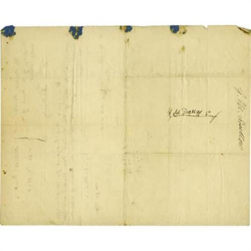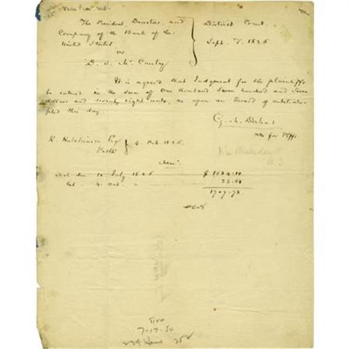 <B>George M. Dallas Autograph Document Signed</B></I> “<I>G. M. Dallas</B></I>”. One page, 7” x 9.5”, September 7, 1826, with endorsements on verso. In this legal document, George M. Dallas as lawyer for the plaintiffs, secures a judgment in favor of his clients for $1,707.78 from the Bank of the United States. George M. Dallas (1792-1864) ultimately served as a Senator from Pennsylvania and as the 11th Vice-President of the United States under James K. Polk. The document has the usual fold creases, with toning to the paper and a few stains along one margin of the verso, else very good. <I>From the collection of Henry E. Luhrs.</B></I><BR><BR><b>Shipping:</b> Flat Material, Small (<a target="_blank" href="http://www.heritageauctions.com/common/shipping.php">view shipping information</a>)
