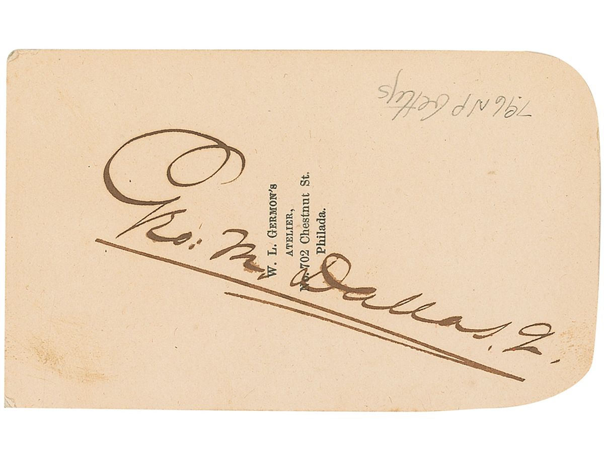 Original 2.25 x 4 carte-de-visite photo by W. L. Germon’s of Philadelphia, signed horizontally on the reverse in black ink, “Geo. M. Dallas, Jr.,” and dated on the front in another hand, “May 23rd 1863.” In fine condition, with rounded bottom corners and some trivial spreading to a couple letters of signature.
