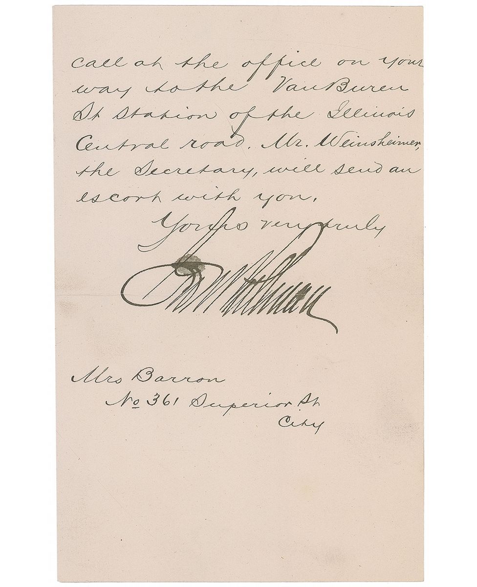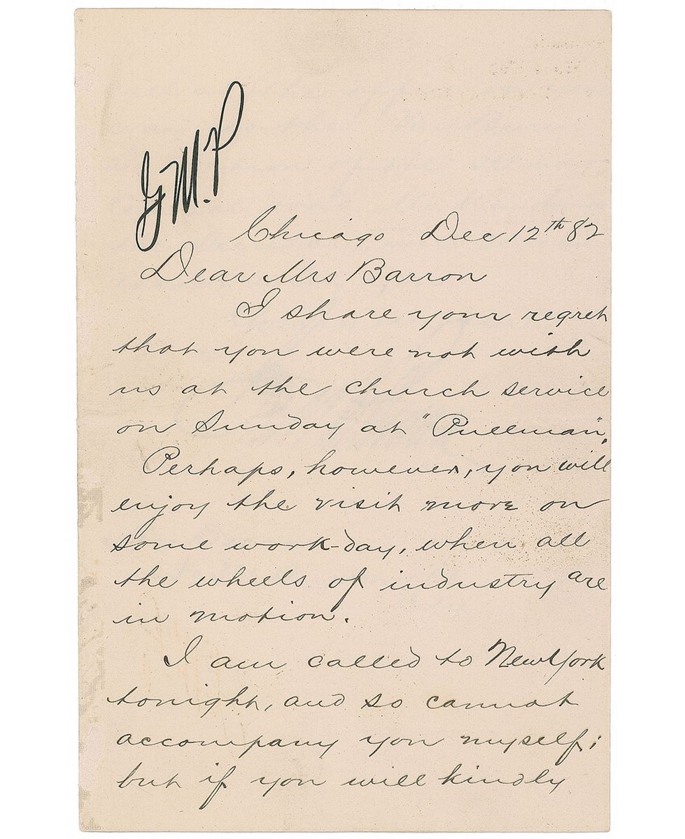 American inventor and industrialist (1831–1897) best known for developing the first successful railroad sleeping car. ALS signed “Geo M. Pullman,” two pages on two adjoining sheets, 4.25 x 6.75, personal letterhead, December 12, 1882. Letter to Mrs. Barrow, in full: “I share with your regret that you were not with us at the church service on Sunday at ‘Pullman.’ Perhaps, however, you will enjoy the visit more on some work-day, when all the wheels of industry are in motion. I am called to New York tonight, and so cannot accompany you myself; but if you will kindly call at the office on your way to the Van Buren St. station of the Illinois Central road, Mr. Weinsheimer, the Secretary, will send an escort with you.” A horizontal fold (passing through the signature), mild paper loss and adhesive remnants to front left edge, and some spreading to ink in a few letters of the signature, otherwise fine condition.