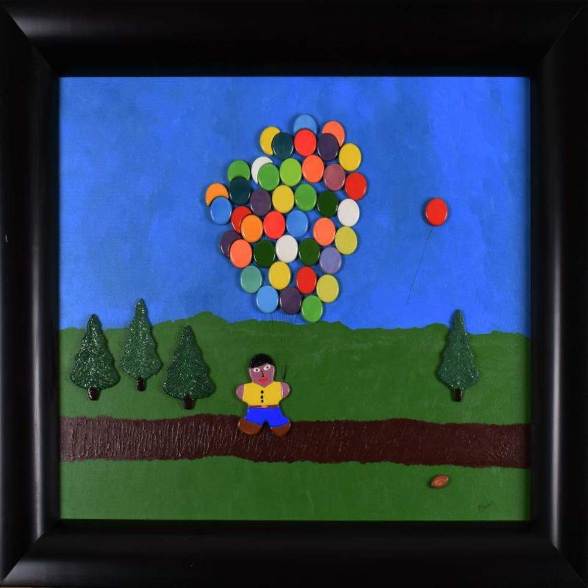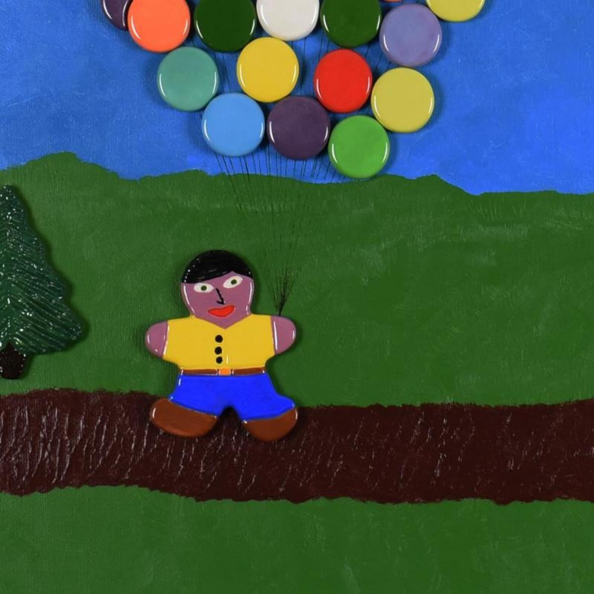"The Balloon Man" is an original acrylic and ceramic mixed media painting on canvas board by George Marlowe. The piece is hand signed, framed, and accompanied by a certificate of authenticity. Measures approximately 22.5x28.5" (frame), 17.5x23.5" (image). Reference #: 230873