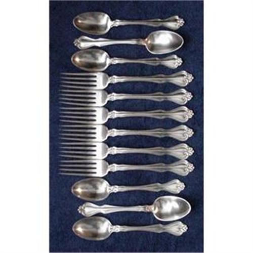 This pattern "George and Martha" was one of those patterns and was created in 1940, the pieces are marked with the Westmorland mark. There are six teaspoons and six place forks. The condition is very good and show signs of minimal use.