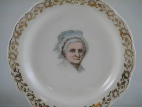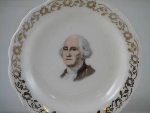 Pair of George & Martha Washington Butter Pats, edged with gold rose vines. Marked: A Capsco Product, Capitol Souvenir Co. Inc, Washington DC". Condition: some scratches on center. Dimensions: 3.375" Diameter.