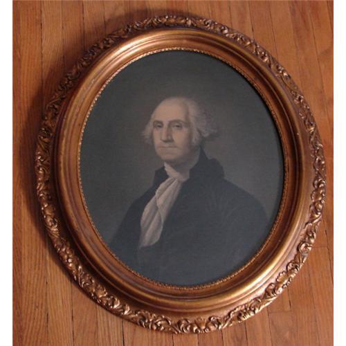 Offered here is a pair of elaborately-framed oval chromolithographs, dating to the year 1861, of George and Martha Washington. Near-pristine in condition, there is a crack in the top of Martha?s frame. Otherwise, the colors are vibrant, the gesso frames are in superb condition, and these are truly a stunning pair of chromoliths. On verso of each, contained under the paper backing: "Warranted oil colors. Entered according to Act of Congress, in the year 1861 by E.C Middleton, in the Clerk's Office of the District Court for the Southern District of Ohio, Cincinnati."