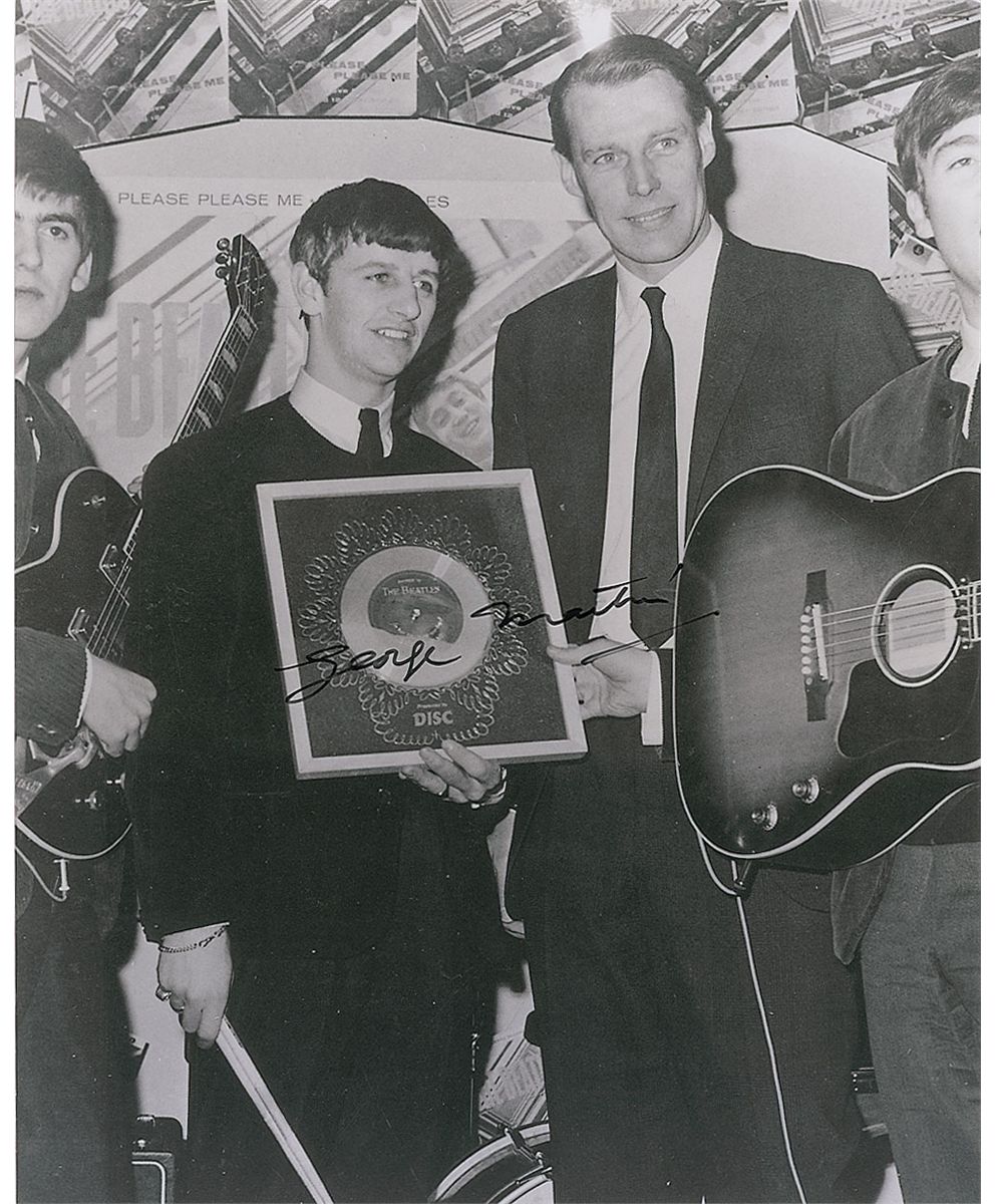 Satin-finish 8 x 10 photo of Martin with members of the Beatles as they are awarded a silver disc, signed in black felt tip. In fine condition. Accompanied by a certificate of authenticity from Tracks.