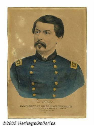 <B>George McClellan Campaign Print by Currier and Ives</B></I> 10" x 14" hand-colored small folio lithograph published by Currier and Ives in 1864, titled "Majr. Genl. George B. McClellan. The Peoples Choice For Seventeenth President of the United States." Evenly, but moderately toned with a few lighter spots in the plain background, to the left of McClellan. Colors (primarily blue, gold and pink) are strong. Lot:258