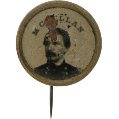 <B>George McClellan Ferrotype Pinback.</B></I> 1864 presidential candidate George McClellan pictured here on a small pinback button backed with brass. Small markings appear on the face of the portrait and on the lettering. McClellan ferrotypes are always considered scarce and this one would go nice into any political collection. Measures 15mm across. <BR><BR><b>Shipping:</b> Miscellaneous Collectibles, Smal (<a target="_blank" href="http://www.heritageauctions.com/common/shipping.php">view shipping information</a>)