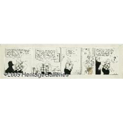 <B>George McManus - Bringing Up Father Daily Comic Strip Original Art, dated 12-7-39 (King Features Syndicate, 1939).</B></I> Jiggs finally gets some quiet time away from Maggie in their hotel room, only to have ruined by an off-key singer next door. And guess who the off-key warbler is?! This uproarious daily displays the hallmarked art deco pen stylings of George McManus and features stylish portraits of Jiggs and Maggie. The image area of the daily is 18" x 4.5", and the art is in Excellent condition. <I>From the collection of Gill Fox.</B></I>