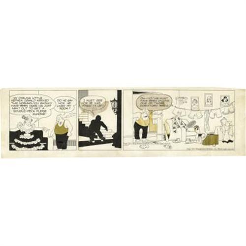 <B>George McManus - Bringing Up Father Daily Comic Strip Original Art, dated 8-9-52 (King Features Syndicate, 1952).</B></I> The stylish art deco designs of George McManus remain one of the high points in comic strip art. This strip has an image area of 18" x 5". Aside from yellowing Zipatone and a few glue stains, the art is in Very Good condition.<BR><BR><b>Shipping:</b> Flat Material, Small (<a target="_blank" href="http://www.heritageauctions.com/common/shipping.php">view shipping information</a>)