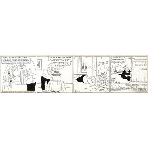 <B>George McManus - Bringing Up Father Daily Comic Strip Original Art, dated 8-20-31 (International Feature Service, 1931).</B></I> Debuting in 1912, <I>Bringing Up Father</B></I> was an immensely popular strip, beautifully designed and drawn with an art deco flair by George McManus. In this episode, Maggie's claim that Jiggs is a klutz proves to be all too true. The image area of this daily measures 17" x 4.25", and the art is in Excellent condition. <I>From the Estate of Bruce Hamilton.</B></I> <BR><BR><B>Important notice:</B> Heritage usually auctions material at the rate of 200-250 lots per hour. On some occasions eBay Live bid software or the Internet may not be able to keep up with the pace of the auction. We recommend placing a realistic absentee bid now as insurance to avoid disappointment. Occasionally the auctioneer may eliminate or reject an eBay Live bid, and the auctioneer may also reopen a lot after the close of the eBay live bidding (usually because we missed an audience bid), and may reject your bid even if it shows you as the winning bidder. By bidding via eBay Live, you agree that Heritage may award the lot to another bidder at its sole discretion under the circumstances described above or any other reasonable circumstances. Since eBay bids are not shown to us until we open the lot on the floor, we treat those bids just like floor bids. In most cases the floor responds before the eBay bid is presented to us, due to Internet lag time, so for consistency we have made it a policy that floor bids are always considered first over tie eBay live bids. Also please note that all Heritage lots purchased through eBay Live carry a 22.5% Buyer's Premium. Please make sure you read the Terms and Conditions before you bid. This lot is being auctioned in conjunction with a live floor auction by Heritage Auction Galleries. All final auction and invoice information will be supplied by Heritage Auction Galleries, and all other information should be considered preliminary. Lot:41001 <BR><BR><B>Winning Notification and Billing:</B> After the FINAL session in this auction is complete, Heritage will send e-mail and snail mail invoices. This process normally takes several days. All final auction and invoice information will be supplied by Heritage Auction Galleries, and all other information should be considered preliminary. <BR><BR>This auction will be conducted on a live auction floor and over the Internet through eBay Live. If you choose to place an absentee bid, please take a moment to <font color='#0000ff'><u><a href='http://pages.ebay.com/liveauctions/help/before/laabsentee.html'>learn how eBay Live absentee bidding works</a></u></font><font color='#000000'>