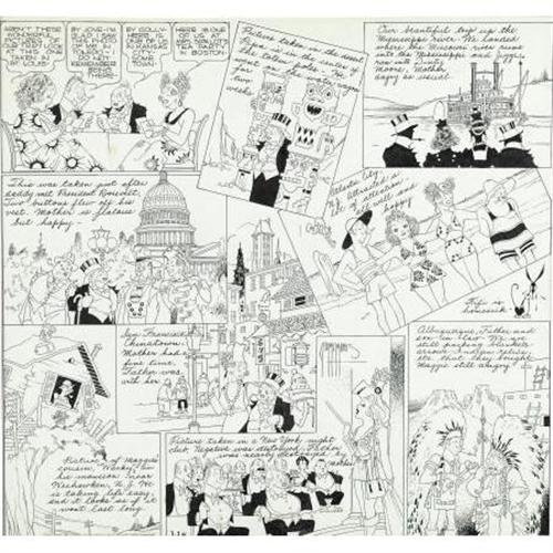 <B>George McManus - Bringing Up Father Sunday Comic Strip Original Art, dated 3-24-40 (King Features Syndicate, 1940).</B></I> The <I>Bringing Up Father</B></I> characters took a tour of the United States in the late thirties and early forties. This wide-ranging Sunday features landmarks of famous American cities, and in this charming episode, Jiggs and Maggie review photographs of their travels to Washington D. C., Atlantic City, Weehawken, San Francisco, New York, and Albuquerque. There are detailed drawings of the famous landmarks, along with several crowd scenes, a George McManus specialty. This dazzling piece has an image area of approximately 16" x 15", and is in Excellent condition. <BR><BR><b>Shipping:</b> Framed - with Glass, Medium (<a target="_blank" href="http://www.heritageauctions.com/common/shipping.php">view shipping information</a>)