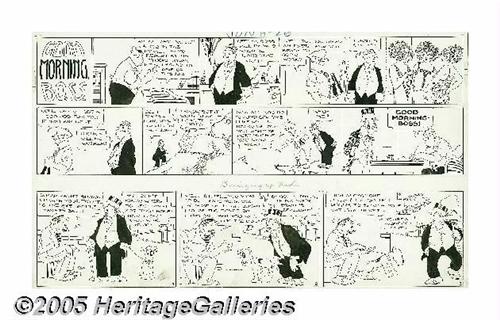 <B>George McManus - Good Morning Boss Sunday Topper Comic Strip Original Art, dated 6-6-26 (King Features Syndicate, 1926).</B></I> And you think <I>your</B></I> job sucks! Here's a <I>Good Morning Boss</B></I> "topper" for George McManus' marvelous <I>Bringing Up Father</B></I> comic strip from one of its peak periods. Also included is the top tier from the June 6, 1926 <I>Bringing Up Father</B></I> Sunday, featuring Jiggs in more hambone hijinks. The image area measures 16.5" x 9.5," and aside from some slight apparent aging, and a bit of soiling at the lower left, the art is in Excellent condition.