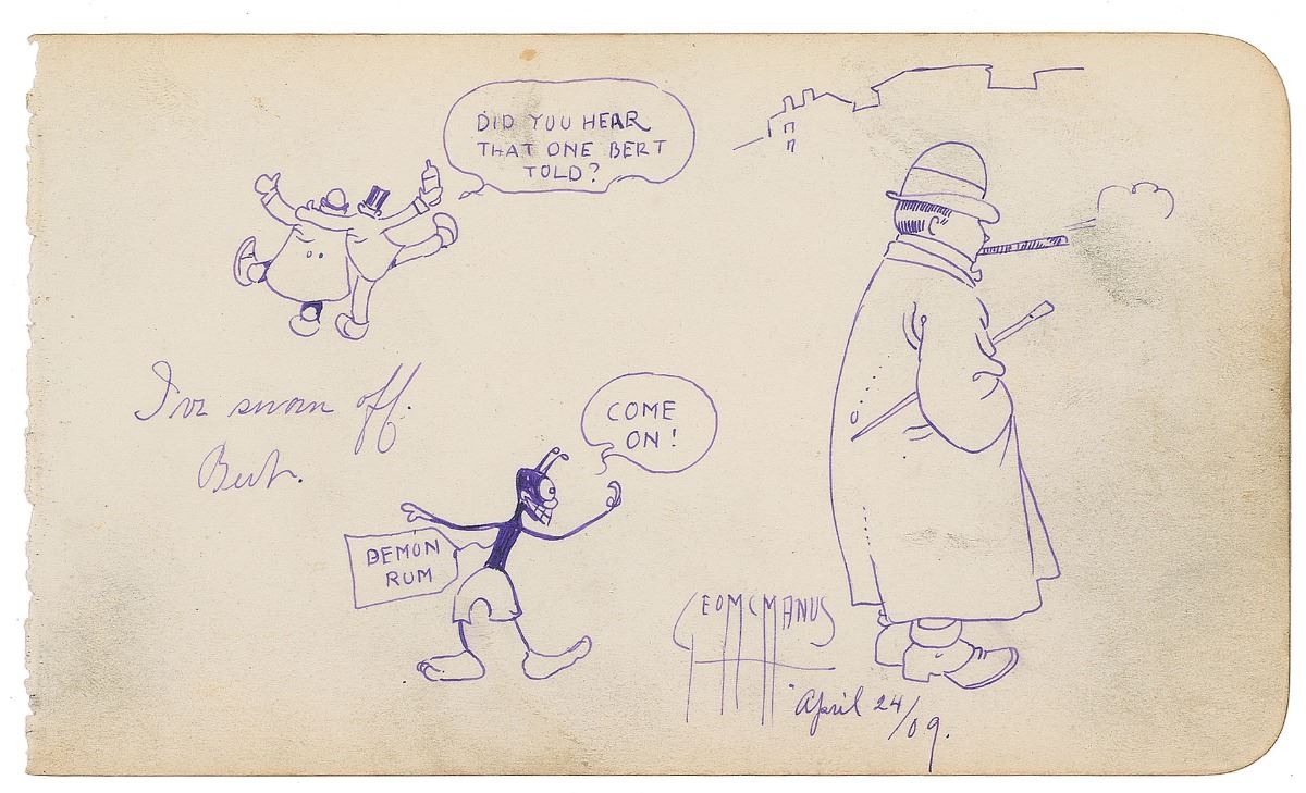 Series of small original ink sketches on an off-white 6.75 x 4 album page, signed below in purple ink, “Geo. McManus, April 24/09.” Sketches include two drunk men walking, the man with a bottle saying, “Did you hear that one Bert told?,” with McManus adding below, “I’ve sworn off. Bert.” Also features a creature with a tag that reads, “Demon Rum,” and saying “Come on!,” as well as a man in a trench coat smoking below an outline of houses. In fine condition, with light soiling to the edges.