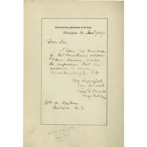 <B>General George Meade Autograph Letter Signed</B></I> "<I>Geo. G. Meade Maj Genl</B></I>". One page, 5" x 8", Head-Quarters, Department of the East letterhead, Philadelphia, January 17, 1867. In part, "<I>...I have no knowledge of M. Faulkner's address- I am however under the impression that his residence is near Martinsburgh Va...</B></I>" Very Fine condition, hinged to a contemporary larger sheet. From the Henry E. Luhrs Collection. Accompanied by LOA from PSA/DNA.