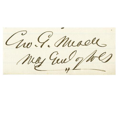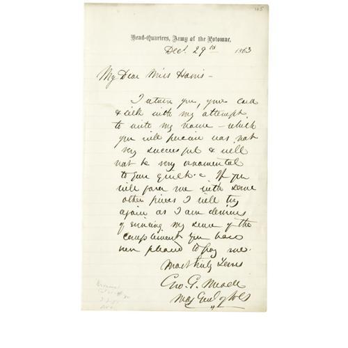 <B>George Meade Civil War Dated Autograph Letter Signed</B></I> "<I>Geo. G. Meade Maj Genl</B></I>". One page, 5" x 8", Head-Quarters, Army of the Potomac letterhead, no place, December 29, 1863, to a Miss Harris. It reads: "<I>My Dear Miss Harris - I return you, your card and silk [not present] with my attempt to write my name- which you will perceive was not very successful & will not be very ornamental to your quilt. If you will favor me with some other pieces I will try again as I am desirous of evincing my sense of the compliment you have been pleased to pay me...</B></I>" During the time of the Civil War, autograph quilts were a popular pastime for the ladies left behind at the home front waiting for their sons and husbands to return from battle. Fine condition. From the Henry E. Luhrs Collection. Accompanied by LOA from PSA/DNA.