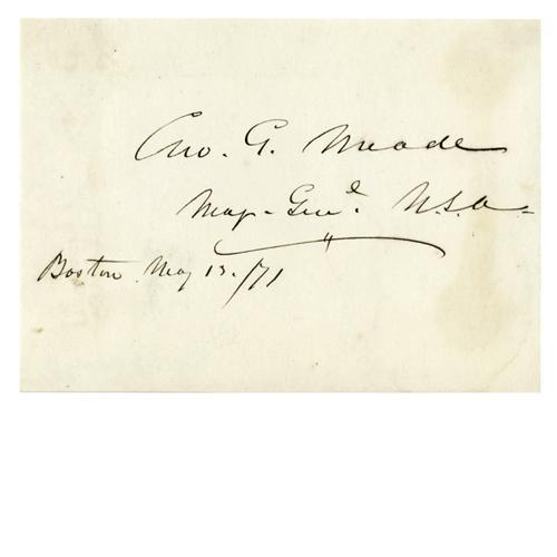 <B>George Meade, Civil War General- Signature</B></I> on 6" x 4.5" sheet,"<I>Geo. G. Meade Maj. Genl. U.S.A. Boston, May 13, 1871</B></I>". A career officer, Meade may be best known for defeating Robert E. Lee at the Battle of Gettysburg. Very Fine condition; just slight evidence of mounting traces on verso showing through. From the Henry E. Luhrs Collection. Accompanied by LOA from PSA/DNA.