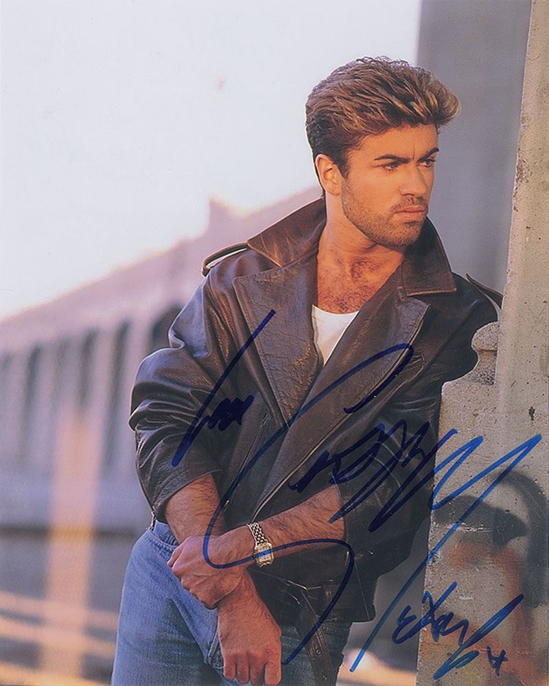 Color glossy 8 x 10 photo of the Wham! singer in a leather jacket, prominently signed in blue felt tip. In very fine condition.