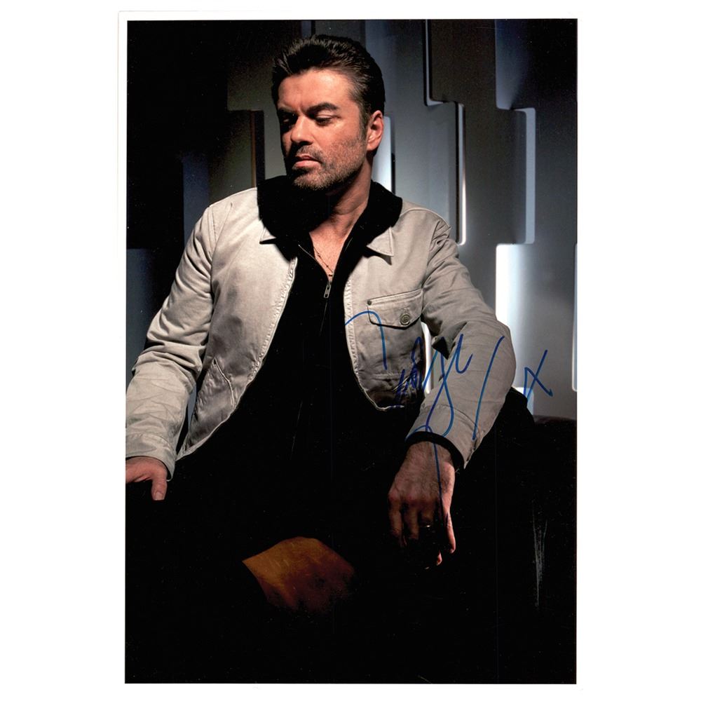 Color glossy 8.25 x 12 photo of George Michael in a pensive seated pose, signed in blue felt tip, "George x." In fine condition, with some small corner creases.
