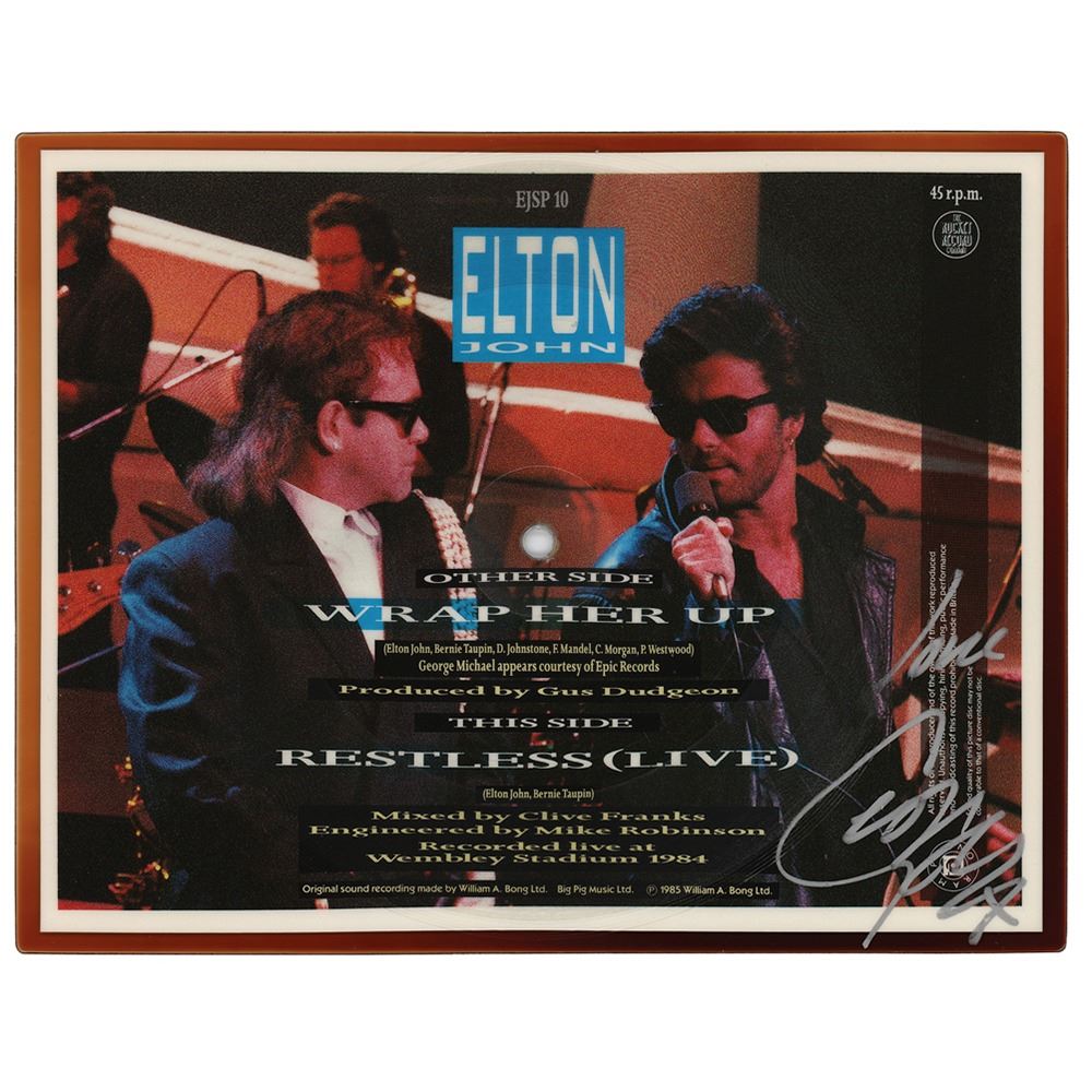 Unusual rectangular Rocket Record 45 RPM picture disc album for the Elton John single ‘Wrap Her Up / Restless (live),’ signed on the front in silver ink, “George Michael, x,†who is featured on the song. In fine condition, with some adhesive residue on the back.