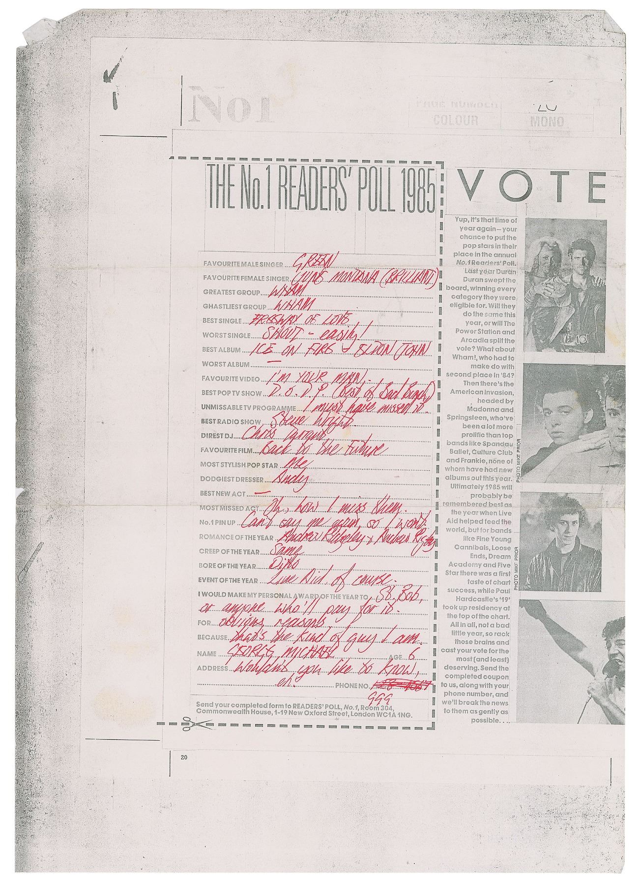 Marvelous DS, one page, 11.75 x 16.5, circa late 1985. A copy of No. 1 magazine's 1985 reader's poll form, which Michael has playfully filled out and signed in red ink. In full: Favourite Male Singer ("Green"), Favourite Female Singer ("June Montana (Brilliant)"), Greatest Group ("Wham"), Ghastliest Group ("Wham"), Best Single ("Freeway of Love"), Worst Single ("Shout—easily!"), Best Album ("Ice on Fire—Elton John"), Worst Album ("—"), Favourite Video ("I'm Your Man"), Best Pop TV Show ("D. O. D. P. (Best of Bad Bunch)"), Unmissable TV Programme ("I must have missed it"), Best Radio Show ("Steve Wright"), Direst DJ ("Chris Tarrant"), Favourite Film ("Back to the Future"), Most Stylish Pop Star ("Me"), Dodgiest Dresser ("Andy"), Best New Act ("—"), Most Missed Act ("Oh, how I miss them"), No. 1 Pin Up ("Can't say me again, so I won't"), Romance of the Year ("Andrew Ridgeley & Andrew Ridgeley"), Creep of the Year ("Same"), Bore of the Year ("Ditto"), Event of the Year ("Live Aid, of course"), I Would Make My Personal Award of the Year to ("St. Bob, or anyone who'll pay for it"), For ("Obvious reasons"), Because ("that's the kind of guy I am"), Name ("George Michael"), Address ("Wouldn't you like to know, eh"), and Phone No. ("999"). In very good to fine condition, with creasing to the edges. A humorous and potentially insightful list of answers from Michael, whose light barbs at fellow Wham! musician Andrew Ridgeley may point to his frustrations with the group's direction; Wham! disbanded the upcoming spring, with both Michael and Ridgeley affirming the break as 'amicable.' Still, 1985 proved a momentous year for the duo, with Wham! undertaking a huge world tour and making an appearance at the Live Aid benefit concert on July 13th, with Michael performing a rendition of 'Don't Let the Sun Go Down on Me' with Elton John.