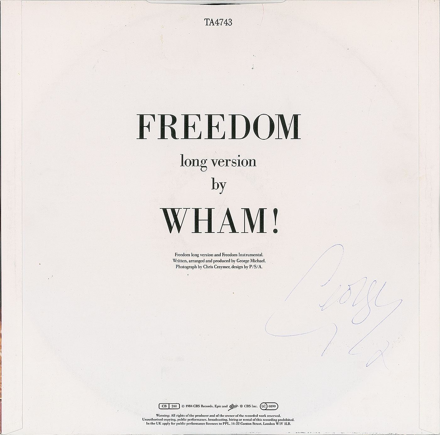 Freedom single album signed on the back cover in blue ballpoint, "George, x." In fine condition. The record is included.