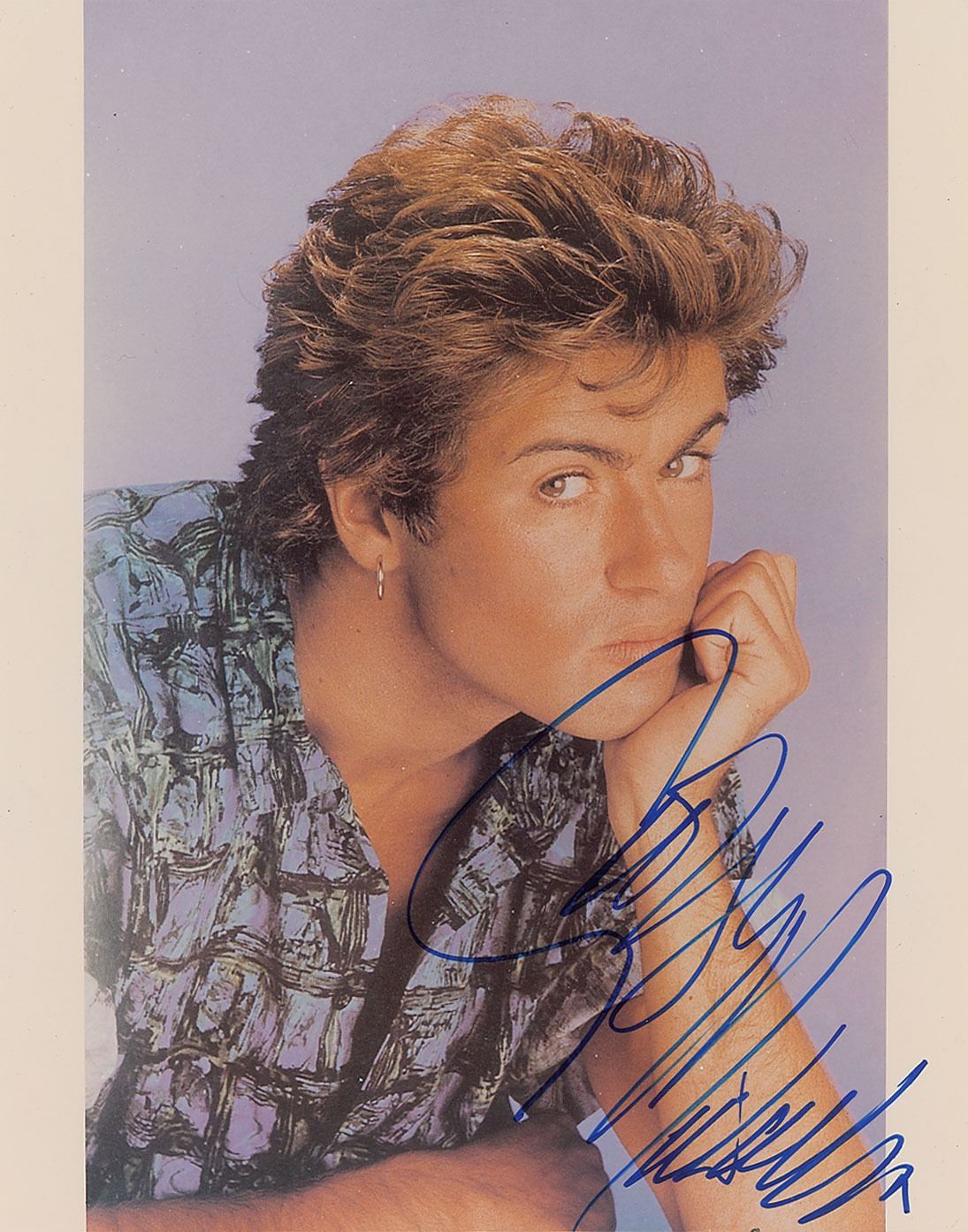 Color glossy 8 x 10 close-up photo of George Michael resting his chin in his hand, signed in blue felt tip. In fine condition, with a few small creases to the upper left corner.