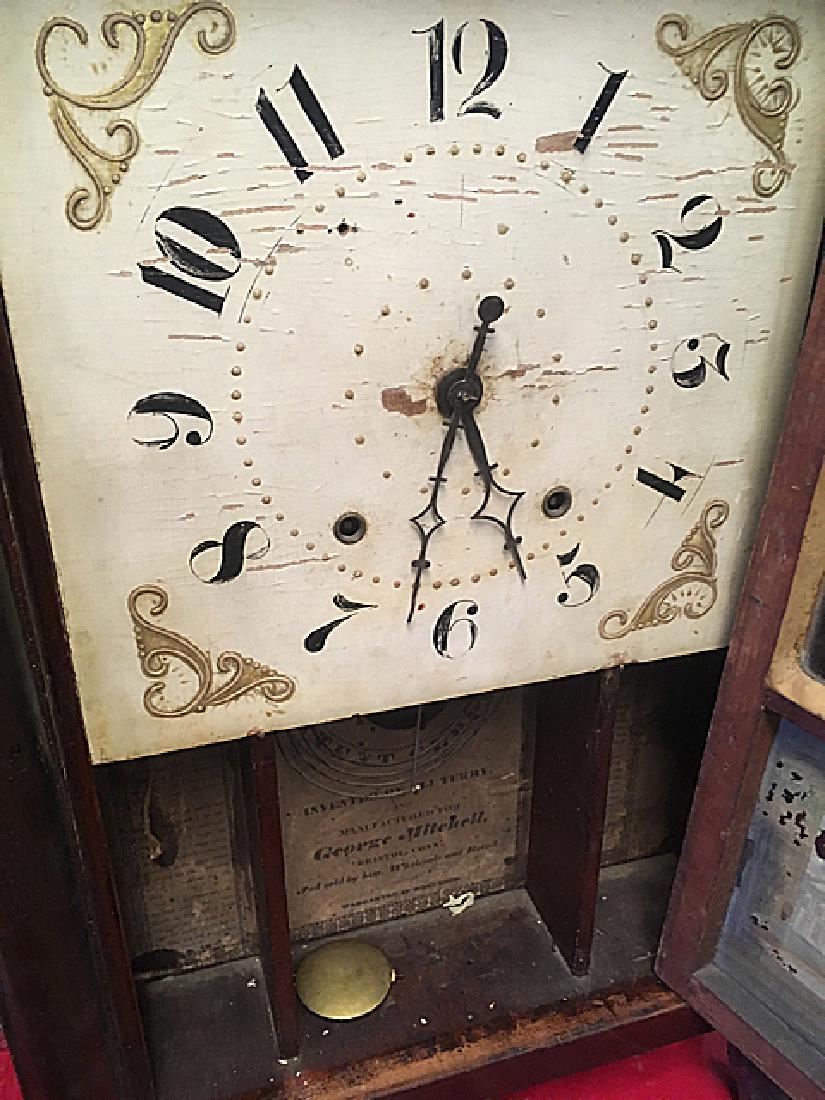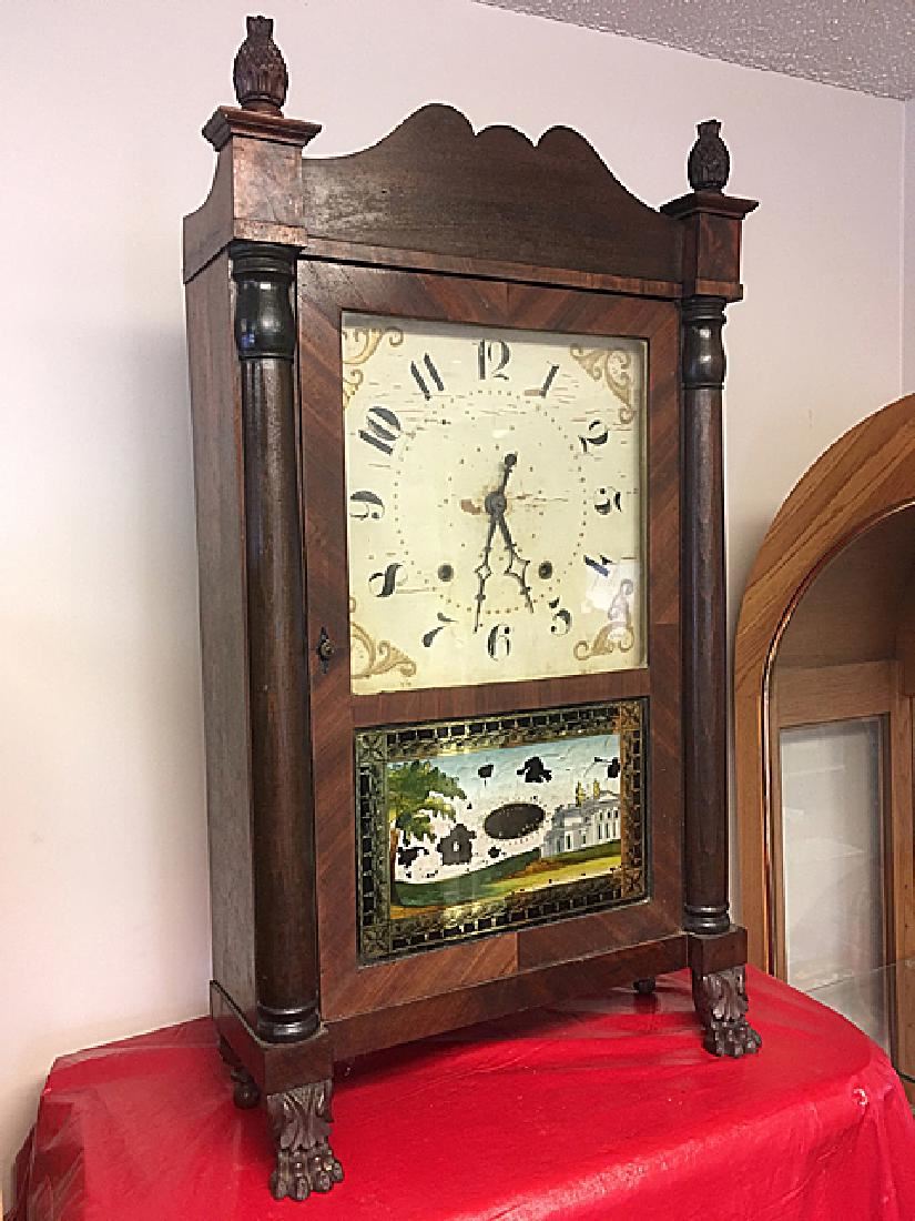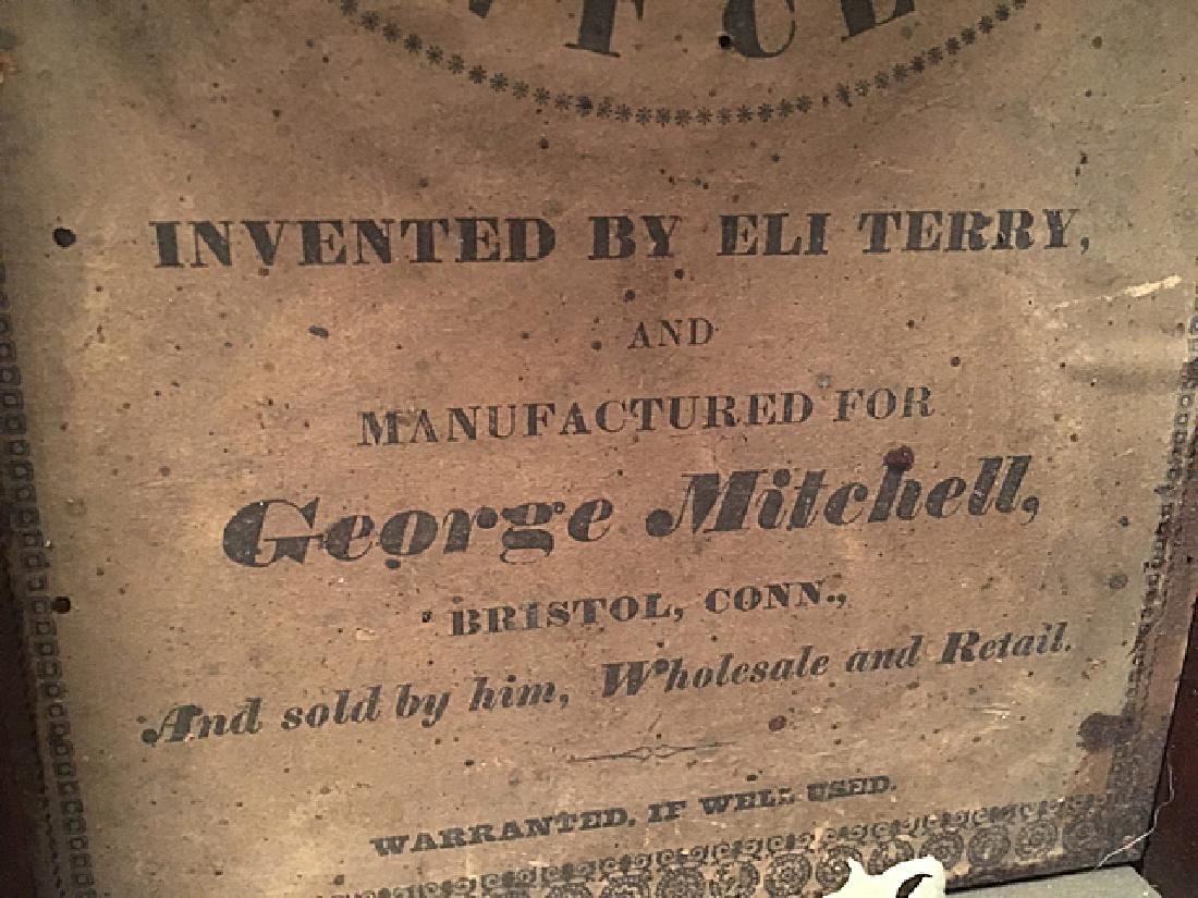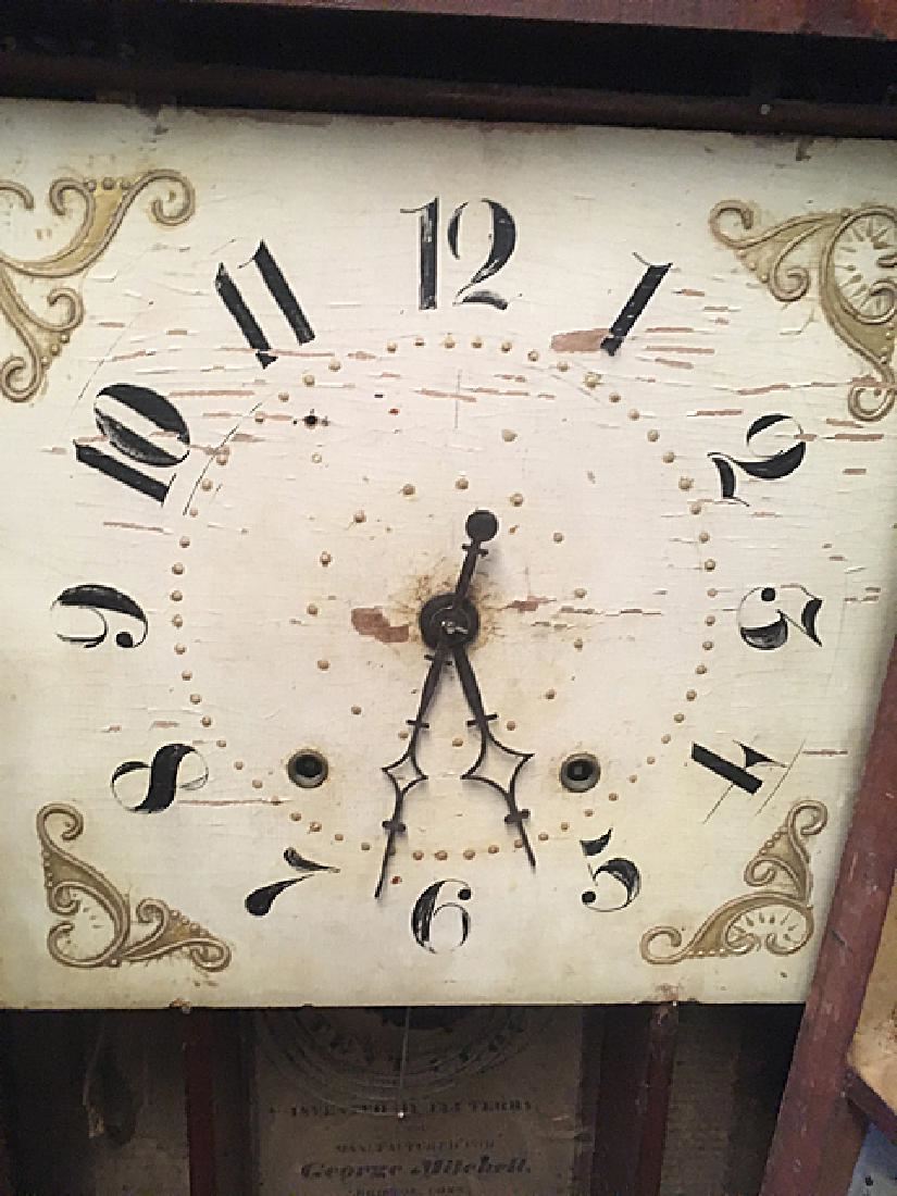 George Mitchell Empire Shelf Clock, Bristol, Conn., c. 1830s, half columns with pinapple finials, splat top, original hand painted dial with gold gilt, reverse painted table, claw feet. Wooden works, weight driven 30 hour clock, very nice label "Patent Clocks, Invented by Eli Terry and Manufactured for George Mitchell, Bristol, Conn." Measures approx. 30" tall x 17" wide x 5 1/2" deep.
