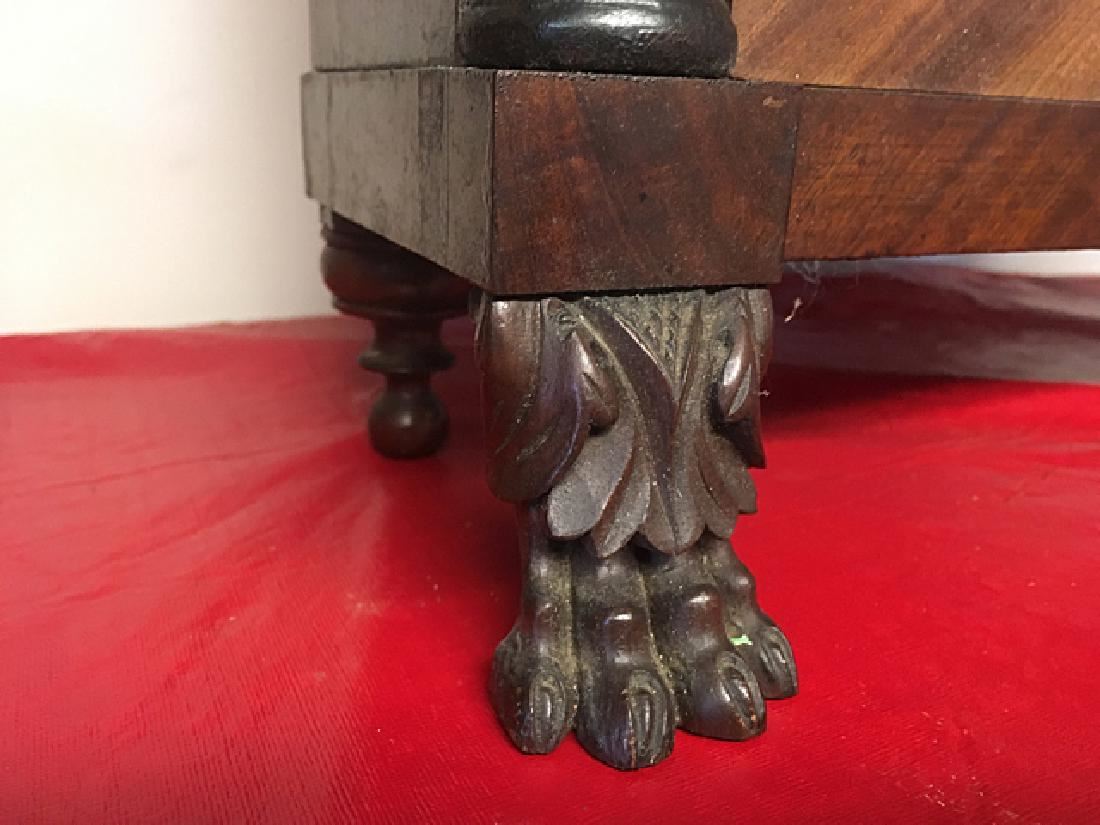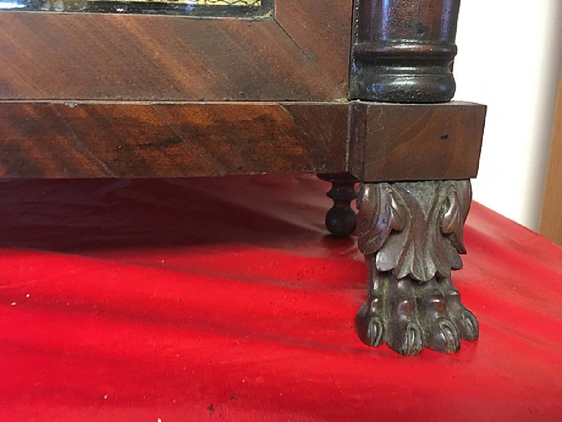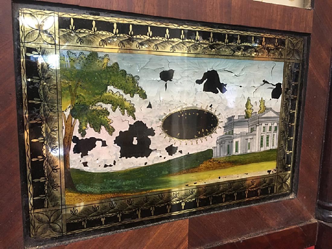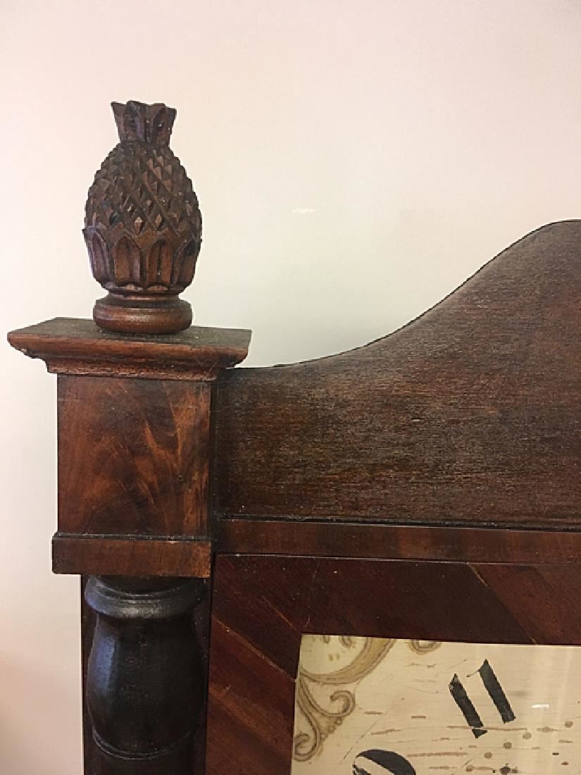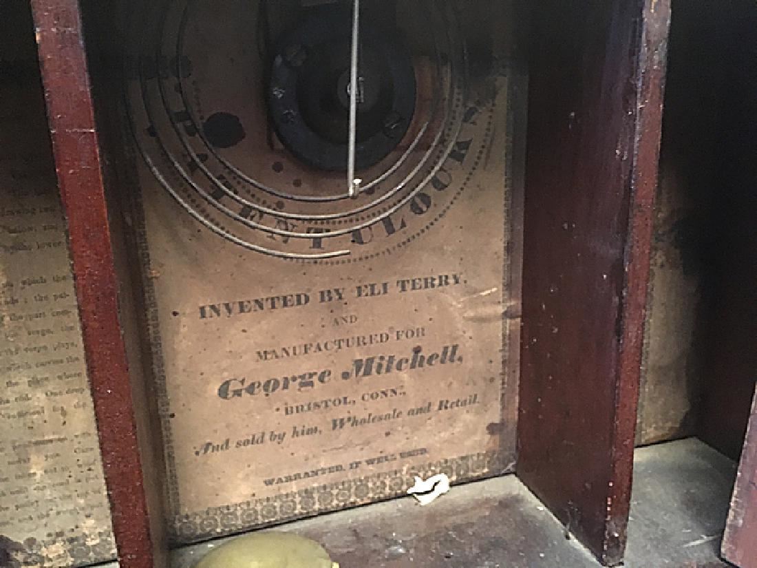 George Mitchell Empire Shelf Clock, Bristol, Conn., c. 1830s, half columns with pinapple finials, splat top, original hand painted dial with gold gilt, reverse painted table, claw feet. Wooden works, weight driven 30 hour clock, very nice label "Patent Clocks, Invented by Eli Terry and Manufactured for George Mitchell, Bristol, Conn." Measures approx. 30" tall x 17" wide x 5 1/2" deep.