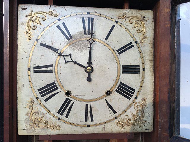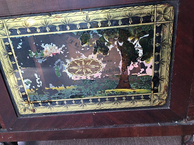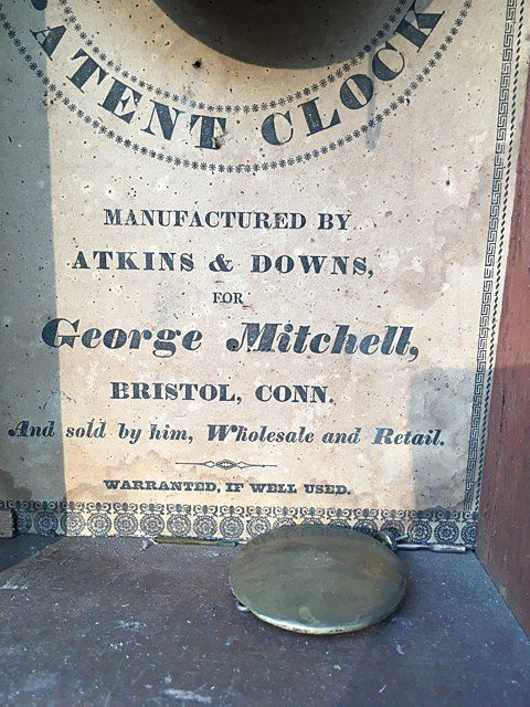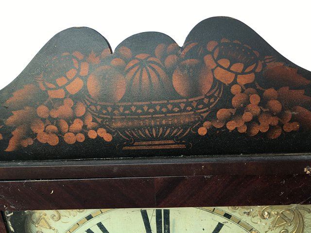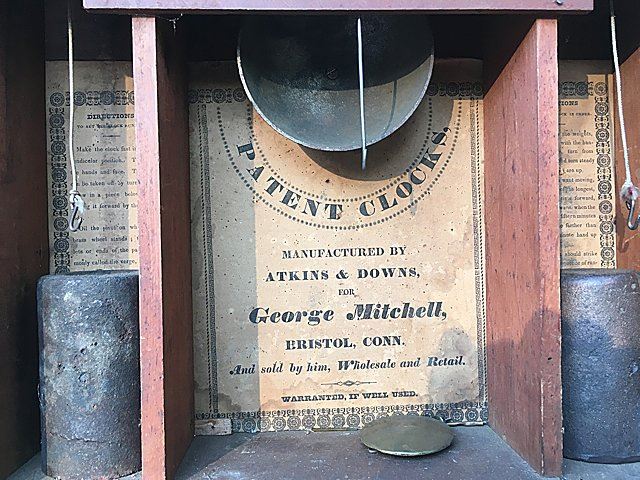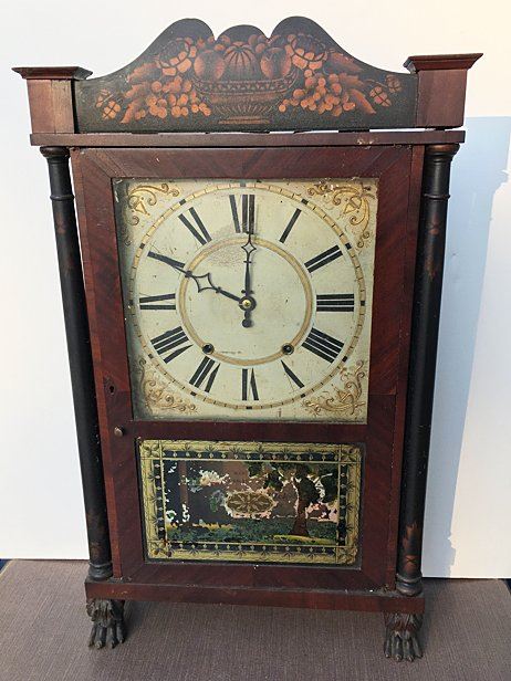 George Mitchell Shelf Clock, Bristol, Connecticut, c. 1830, "Manufactured by Atkins & Downs for George Mitchell, Bristol, CT". Mahogany case with stenciled splat and colomns. Splat features stenciled fruit bowl. Claw feet, hand painted clock dial with Roman numerials, open diamond hands, reverse painted tablt, and beautiful label. Wooden works, weight driven clock with pendulumn. Measures approx. 29" tall x 16"wide x 4" deep.