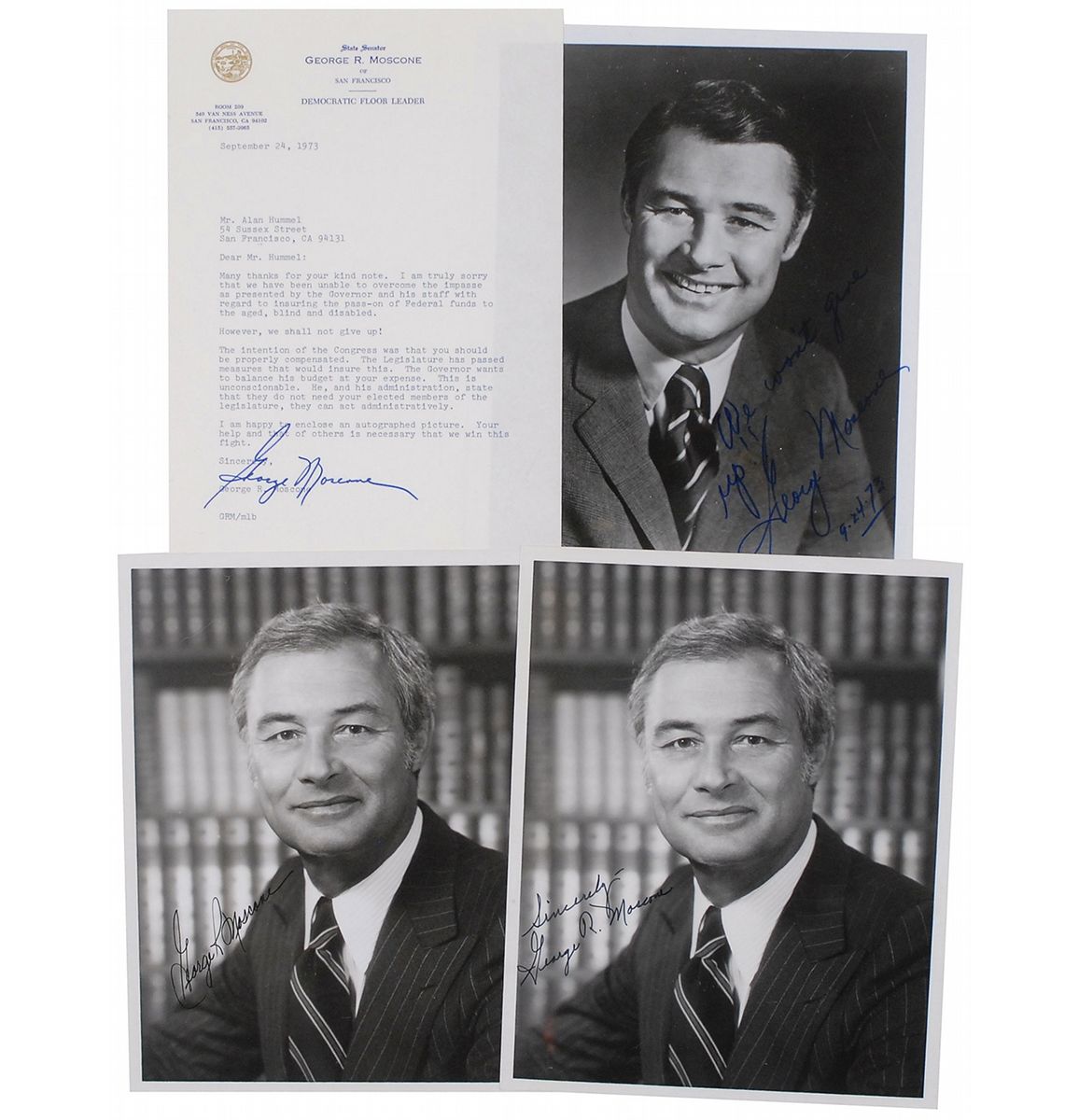 Former California state senator and mayor of San Francisco (1929–1978), who was murdered along with Harvey Milk by a former city supervisor. Four items: three glossy 8 x 10 photos, two signed in black felt tip, and one signed and inscribed in blue felt tip; and a one-page TLS from Moscone, 7.25 x 10.5, State Senate letterhead, dated September 24, 1973. Letter reads, in part: “I am truly sorry that we have been unable to overcome the impasse as presented by the Governor and his staff with regard to insuring the pass-on of Federal funds to the aged, blind and disabled.” In overall fine condition. Accompanied by two newspaper clippings about Moscone’s death.