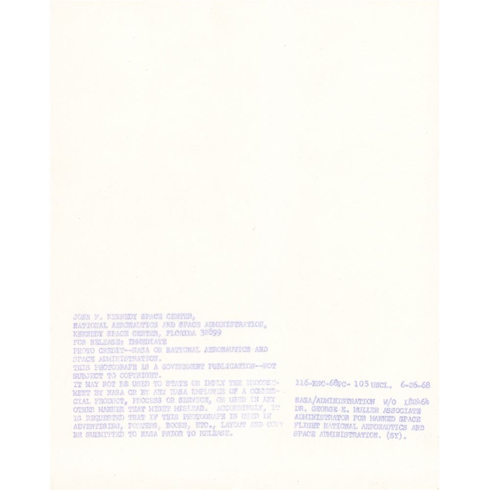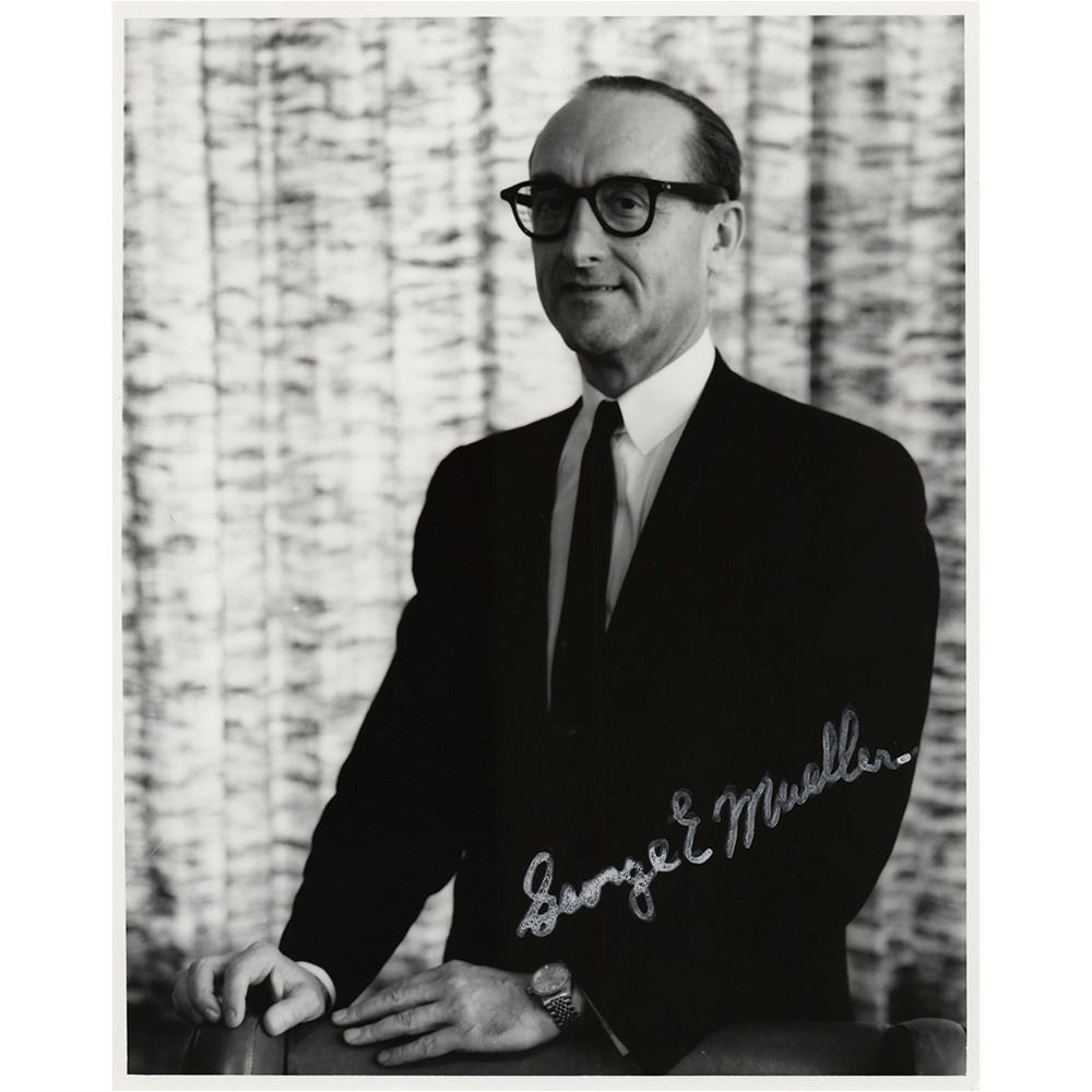 Official semi-glossy 7.75 x 9.75 NASA photo of the administrator of the NASA's Office of Manned Space Flight, signed in white ink, "George E. Mueller." Reverse bears NASA caption text. In fine condition.