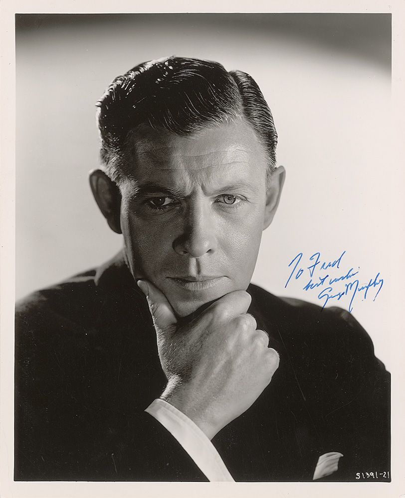 Glossy 8 x 10 double weight MGM publicity photo for The Arnelo Affair, signed and inscribed in blue ink “To Fred, Best wishes, George Murphy.” In fine condition.