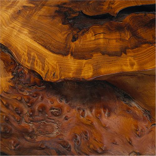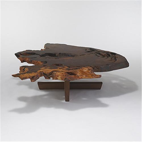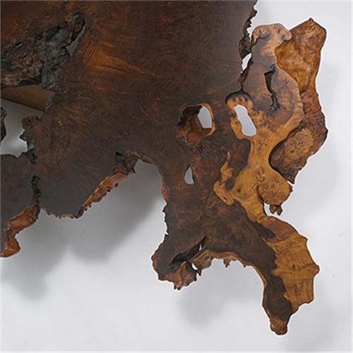 An exceptionally figured solid redwood slab top with sap grain detail, numerous fissures, burls, free edges and four walnut butterflys to underside. Client name to underside: [Hoffman].