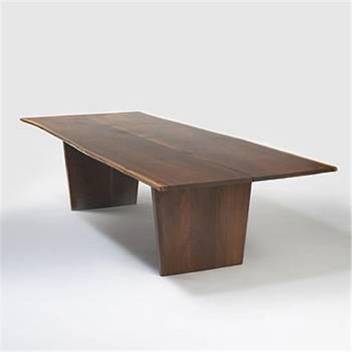 George Nakashima Minguren dining table USA, 1977 American black walnut, rosewood 120 w x 47 d x 28.25 h inches The simplicity of this table belies the elegance and craftsmanship of such a large-scale design. The book matched, sap grain top is joined by five rosewood butterfly joints, resting on two plinths; the ten-foot surface expands in a dramatically rectilinear fashion. Tables of this size are a rarity in the market; Nakashima created this form specifically for the residence of architect John Hoffman, a home designed in the style of Frank Lloyd Wright. Provenance: Acquired directly from the artist John Hoffman, Pennsylvania