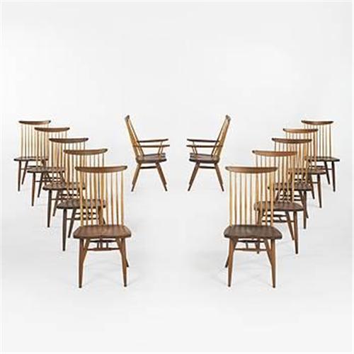 George Nakashima New chairs, set of twelve USA, 1977 American black walnut, hickory 25 w x 24 d x 38.75 h inches Hand signed to each example: [Hoffman]. Provenance: Acquired directly from the artist John Hoffman, Pennsylvania