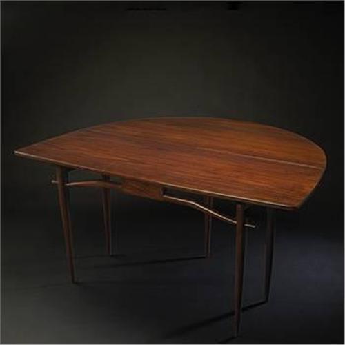 George Nakashima<BR>Origins drop-leaf dining table<BR>Widdicomb<BR>USA, 1958<BR>walnut<BR>59.5"w x 47.5"d x 28.5"h<BR>Literature: George Nakashima and the Modern Moment, Beyer, pg. 28 illustrates a Widdicomb advertisement featuring this form<BR><BR><BR><BR><BR>