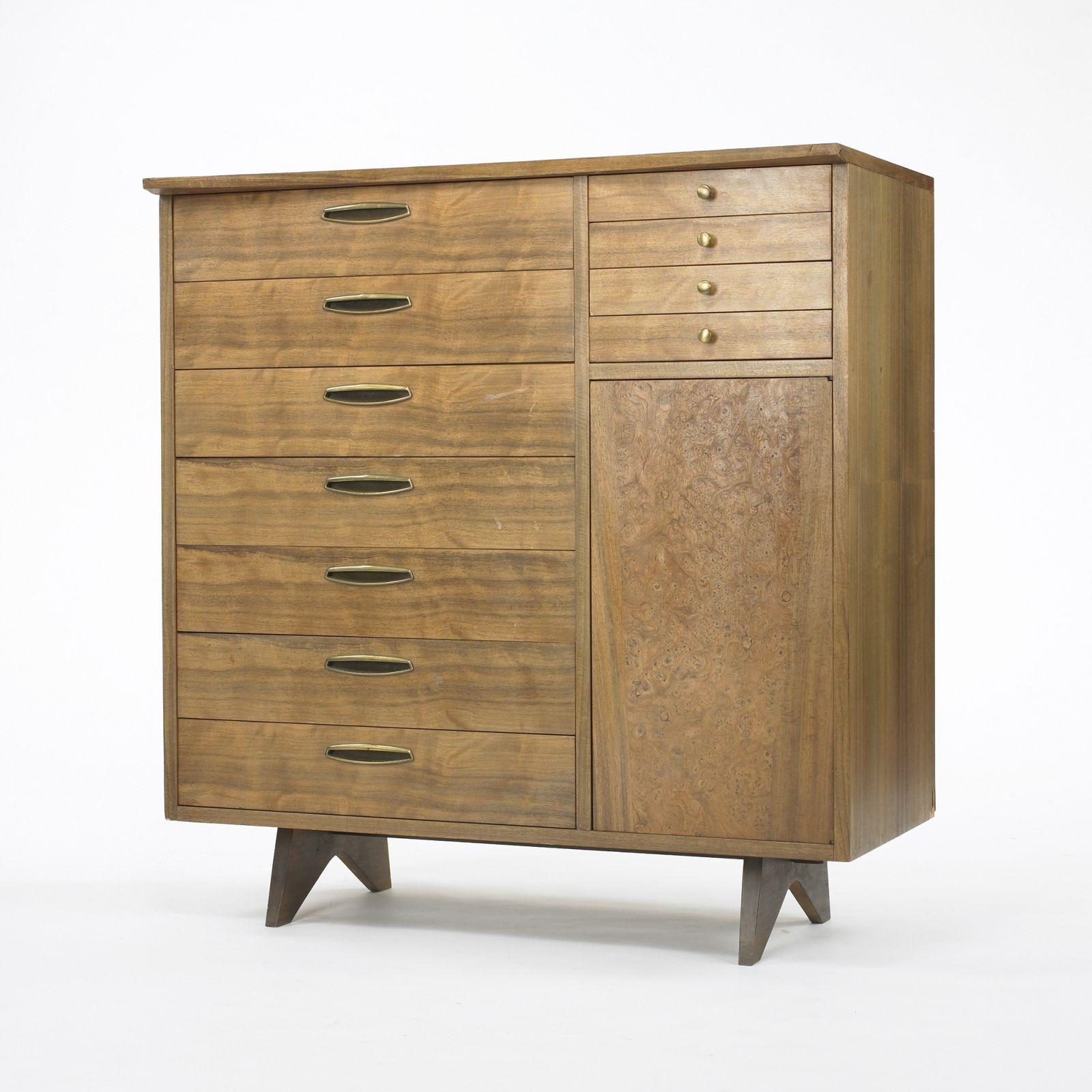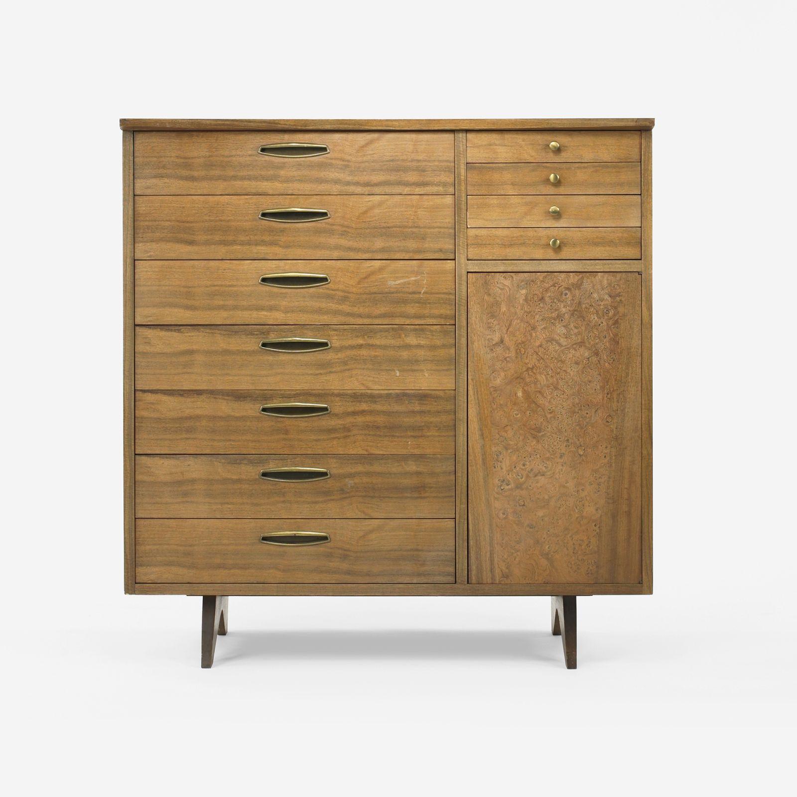 Cabinet features eleven drawers and one door concealing two adjustable shelves. Signed with fabric manufacturer's label to drawer: [Widdicomb Grand Rapids] with branded signature: [George Nakashima].