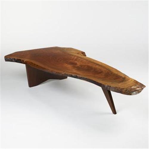 George Nakashima<BR>Slab coffee table<BR>USA, c. 1965<BR>English black walnut <BR>66 w x 33 d x 13 h inches<BR>Expressive double free-edge solid top with knot and worm-hole detail. Client name to underside: [Sharlin].<BR>Literature: <BR><i>George Nakashima, Woodworker</i>, studio catalog, unpaginated<BR><BR>Condition of the item is not included in this description. Condition reports are available from Wright upon request. Wright strongly recommends that you review a condition report for each item on which you plan to bid.