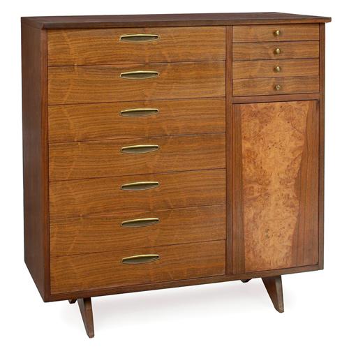 Fine George Nakashima cabinet, by Widdicomb, seven drawers at left with cutout pulls, four shallow drawers above one door with two shelves on right side, marked with cloth Widdicomb tag and burned mark George Nakashima, original finish,47in.w x 22.25in.d