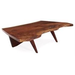 George Nakashima coffee table, slab top in solid walnut with free-form edge to front and sap edge to back, butterfly joints on ends, original finish, 60.26”w x 30.5”d x 14.25”h, very good condition