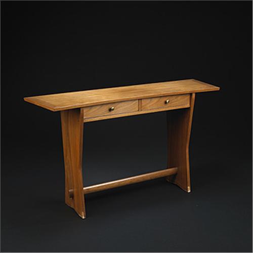 George Nakashima console, model #265-W Widdicomb USA, c. 1950 American Black walnut, brass 50"w x 14.5"d x 29"h Cloth manufacturer's label to interior drawer. Signed with manufacturer's label and branded mark to underside: [Sundra].