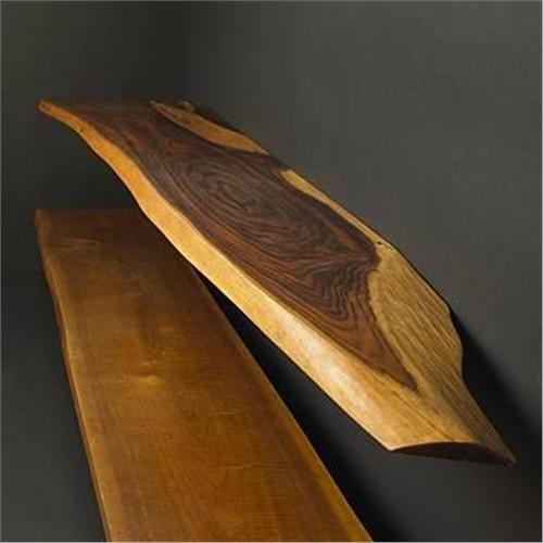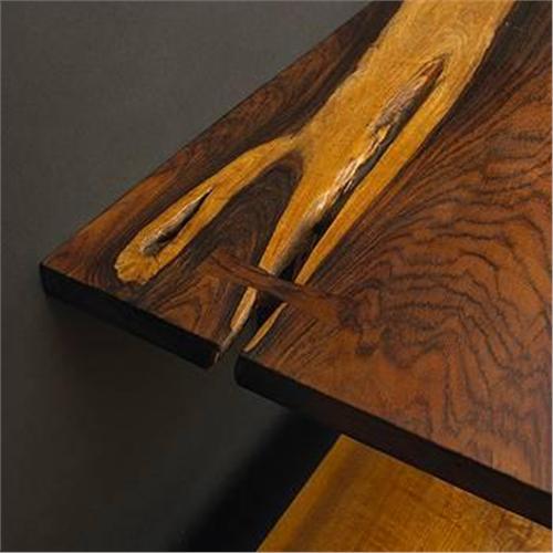 George Nakashima custom hanging wall shelf USA, 1960s rosewood, American walnut 109"w x 22"d x 14.5"h This monumental rosewood slab with dramatic figuring and butterfly detailing includes its original rosewood wall-mounted brackets.