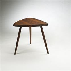 George Nakashima occasional table USA, 1955 walnut 27"w x 22"d x 21"h Single triangular board form with tapered edge and thru-tenon detail to top. Provenance: Dr. Marvin Weiner, New York