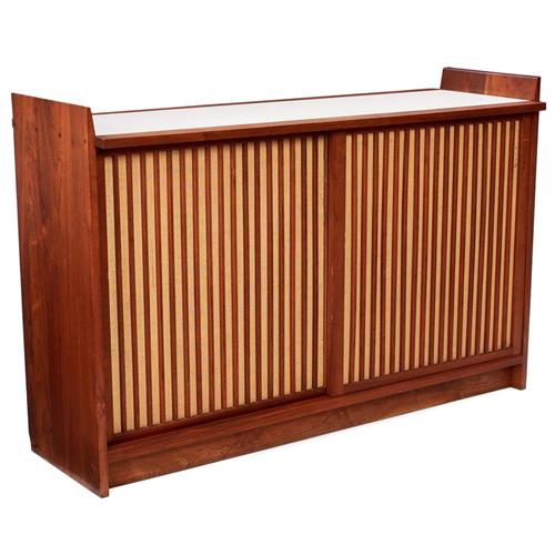 George Nakashima sideboard, walnut case with an inset white laminate top and two grasscloth covered sliding doors, one fixed shelf to interior, original finish, 66"w x 22.5"d x 43.25"h, very good condition