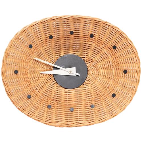 George Nelson Associates Basket clock, by Howard Miller, oval rattan basket with black hour markers around a black enameled center with white metal hands, signed with Howard Miller label and stamped number 2215, 13"w x 11"h, very good conditio