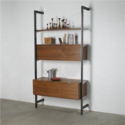 George Nelson & Associates CSS (Comprehensive Storage System) Herman Miller USA, 1959-73 aluminum, walnut, steel 49"w x 21"d x 95"h Uncommon 48" width featuring a shelf, hinged door cabinet, and file drawer case. Signed with a Herman Miller disc label.