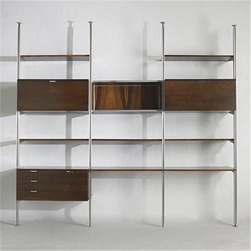 George Nelson & Associates Comprehensive Storage System (CSS) Herman Miller USA, c. 1964 rosewood, aluminum, glass 102.75 w x 19.75 d x 94.5 h inches Rarely seen in rosewood, this set is comprised of four ceiling-mounted uprights, seven shelves, one four-drawer cabinet, two drop-front storage cabinets and one storage cabinet with sliding glass doors.