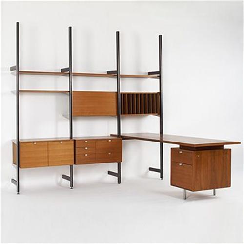 George Nelson & Associates Comprehensive Storage System (CSS) Herman Miller USA, c. 1964 walnut, enameled metal, aluminum 97 w x 84 d x 95 h inches Four uprights support six shelves, three cabinets and one wall-mounted desk with a two-drawer support. Signed with manufacturer's disk label to interior drawer.